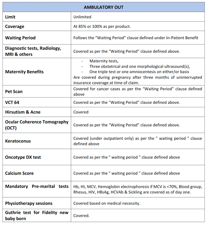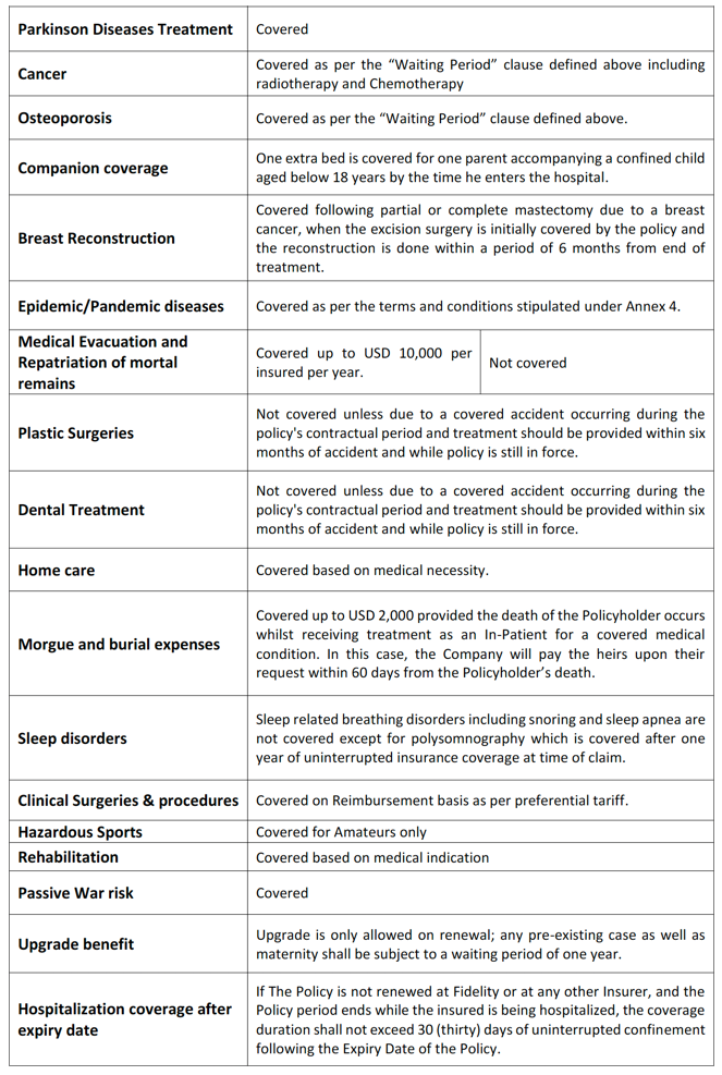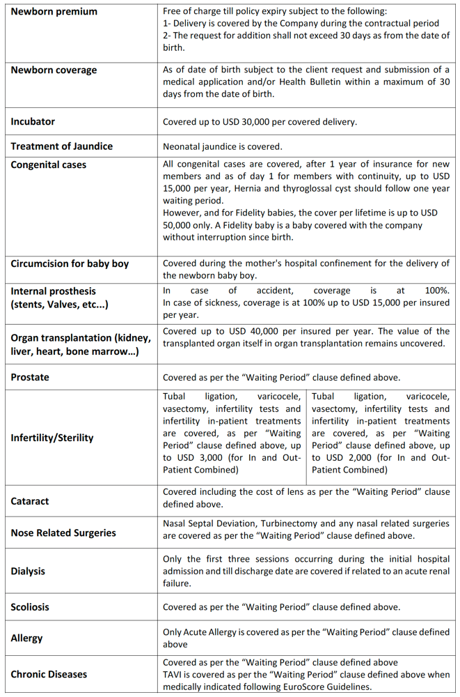 • Ligament and meniscus disease or surgery (unless mandated by a covered accidental injury), thyroglossal cyst, hernia, disc, endometriosis, carpal tunnel, hemorrhoids, gall bladder, ulcer, tonsillectomy, infant paralysis, kidney and urinary tract diseases (except for Fidelity baby who shall be covered as from Day One as per POLICY terms and conditions), retinal surgery, vitrectomy, prostate, cataract, synovectomy, hysterectomy, Women genital organ diseases except for Ovarian Cyst that is not congenital and Uterine Fibroma, Polysomnography.